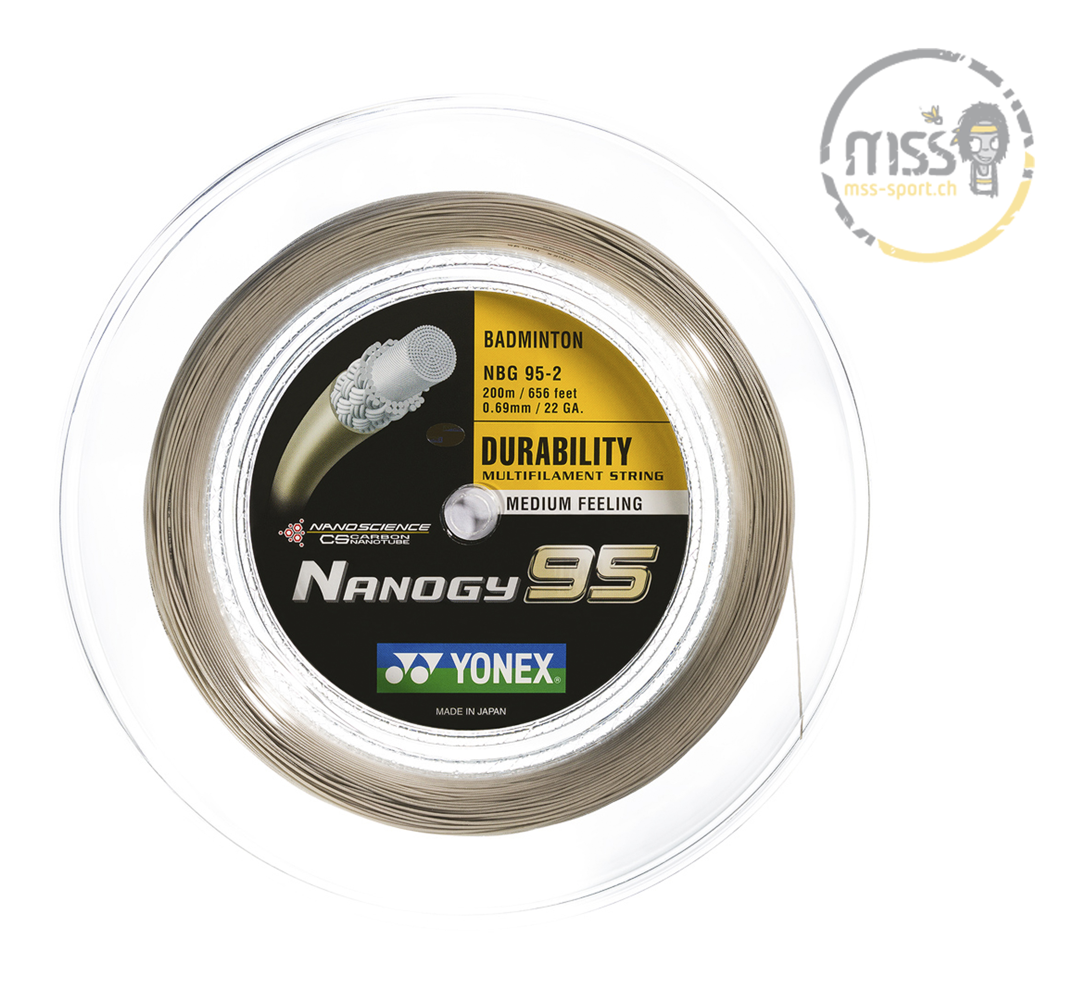 Weiter geniesse ich die raue Oberfläche der YONEX NANOGY 95. Dadurch sind Finten und geschnittene Schläge so viel einfacher zu spielen. Mit 0.69 mm Durchmesser ist die sie eine der haltbarsten Saiten von YONEX.