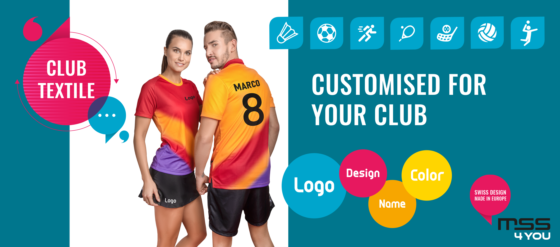 à partir de 15 pièces ° t-shirts à partir de CHF 39.90 ° noms, initiales, numéros ° t-shirts, polos, shorts hoodies, pantalons, vestes ° délai de livraison de six semaines ° possibilité de réassortiment à tout moment et pendant des années ° cpoupes entants, femmes et unisexes ° matériau respirant ° matériau agréable à porter ° tissus différentes